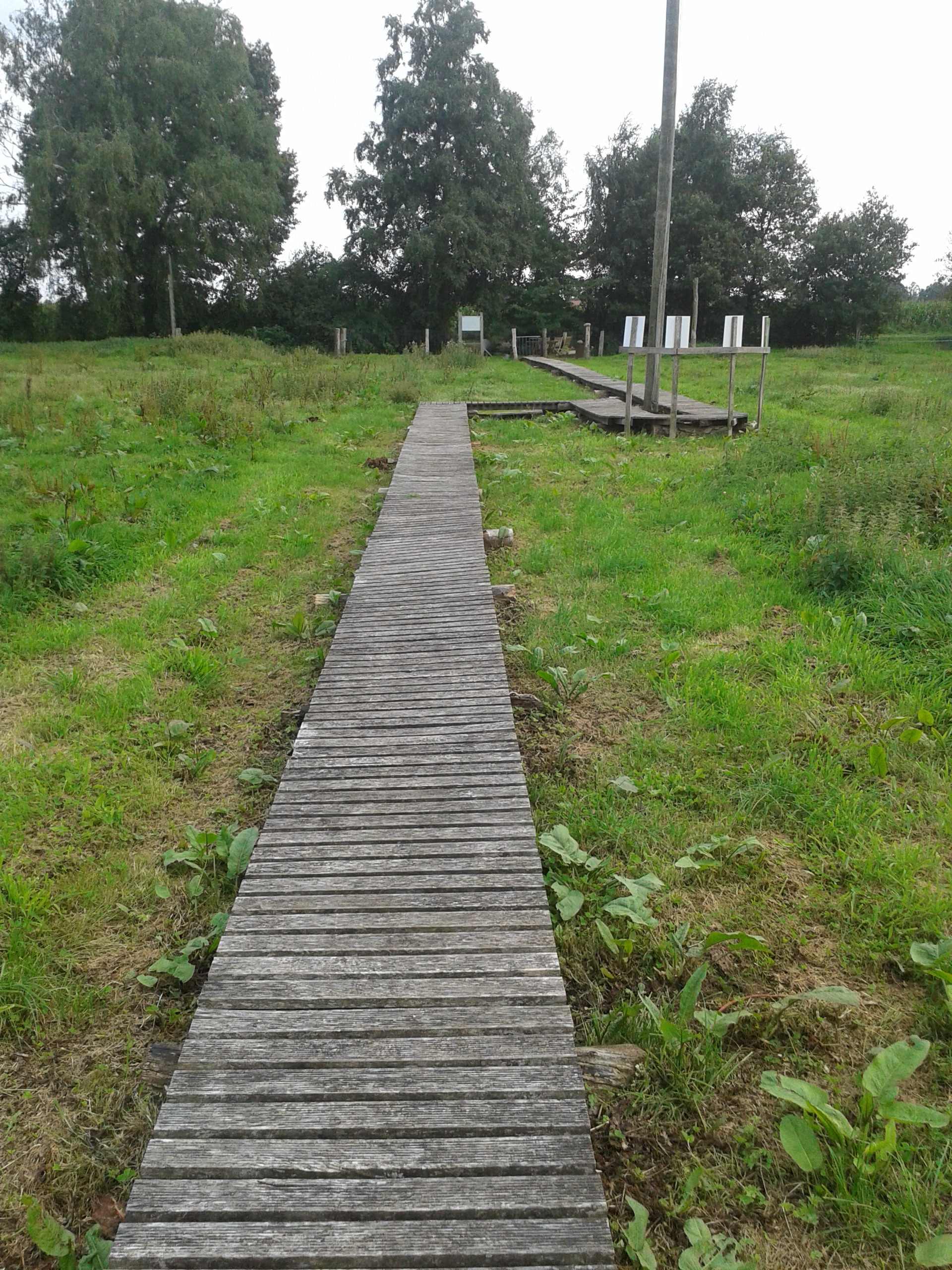 Auf der schon erwähnten Seite: begehbare Labyrinthe, habe ich mir die Bilder von den vielen Labyrinthen angesehen. Dabei blieb ich bei dem Foto von dem Labyrinth in Campemoor hängen. Von oben gesehen hat es schon gewaltige Ausmaße. Sogar auf google earth ist es eindeutig zu erkennen. Wie würde es sein, dieses Labyrinth zu gehen, fragte ich mich. Und so machten wir uns auf nach Campemoor, knappe zwei Stunden Autofahrt von uns entfernt. Das Labyrinth liegt eher versteckt, auf einem unscheinbaren Zufahrtsweg. Ein Holzsteg führt über eine Schafsweide bis zum Labyrinth.